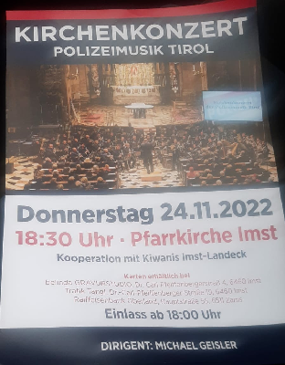 Am 24. November 18:30h in der Pfarrkirche Imst spielte die Polizeimusik Tirol mit über 60 Musiker in Imst für den Kiwanisclub Landeck-Imst. Der Reinerlös wird für unverschuldet in Not geratenen Familien mit Kindern in der Region verwendet. Es war für alle Besucher ein fantastisches Musikkonzert.